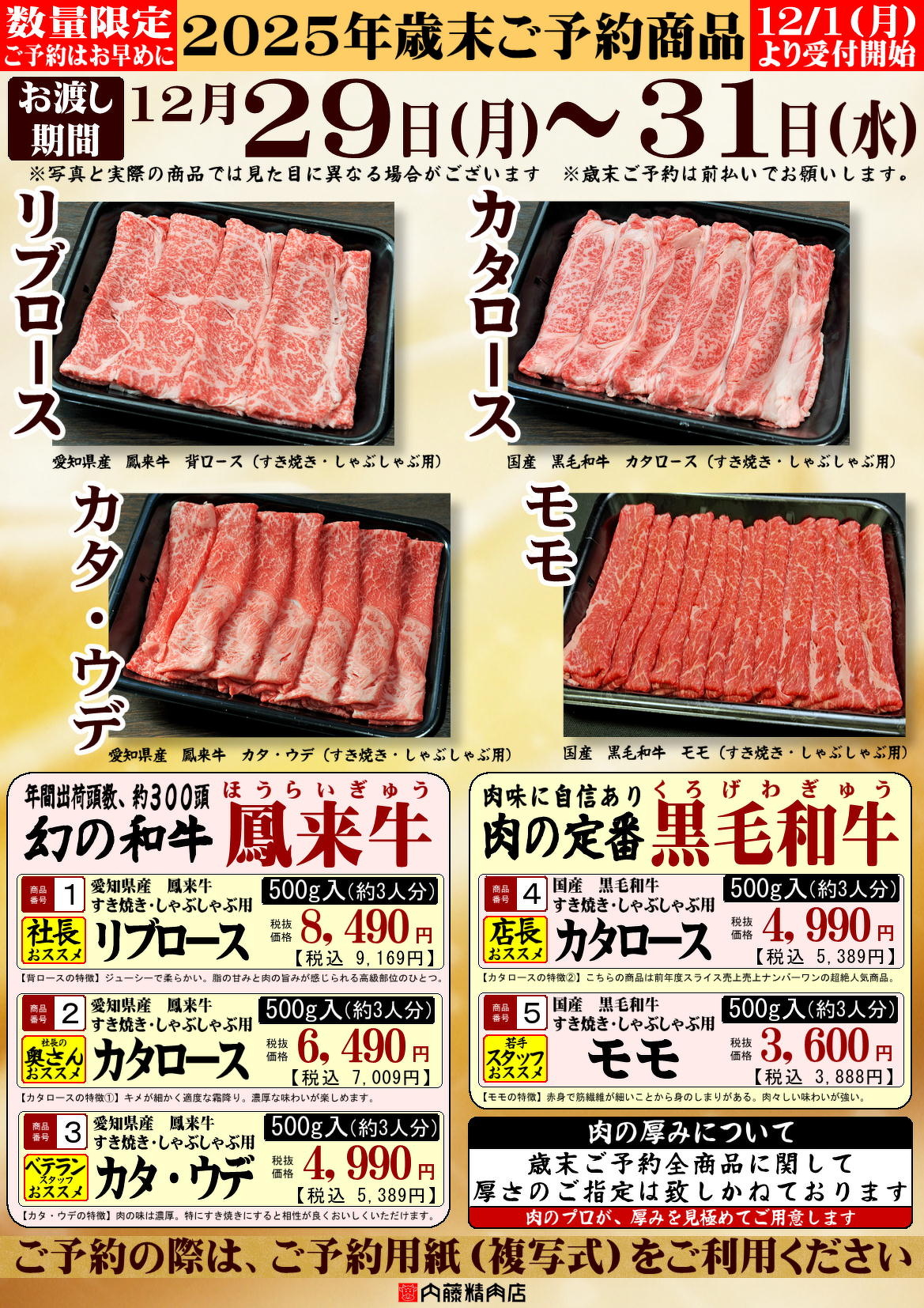 2025年12月29日(月)から12月31日(水)に店頭でお受け取りいただく「歳末商品」(数量限定)のご予約を受け付け致します。